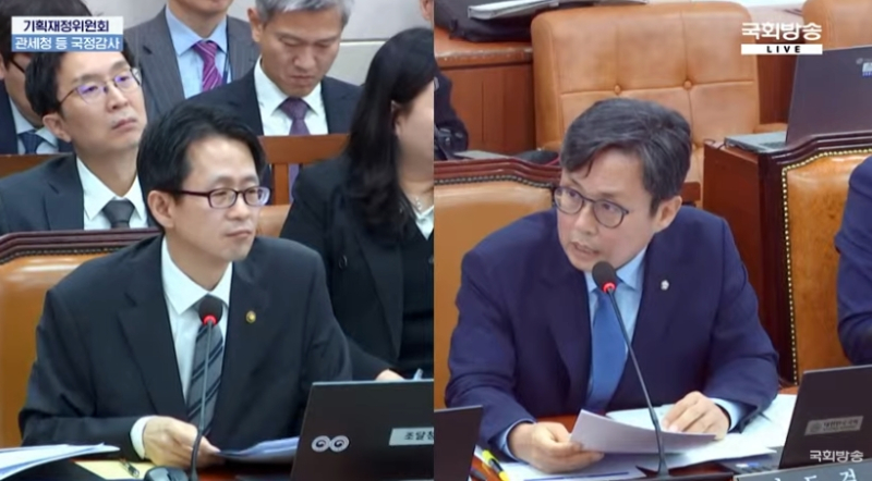 21일 국회 기획재정위원회 조달청 국정감사에서 백승보 조달청장에게 질의하는 더불어민주당 안도걸 국회의원. 국회방송 캡쳐