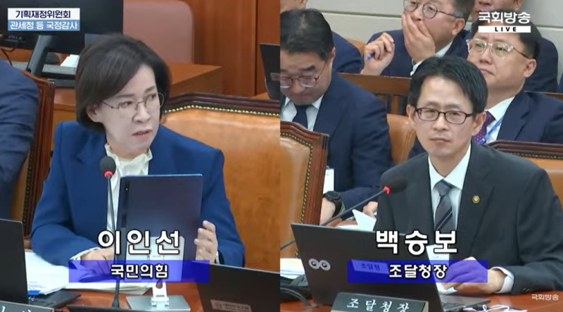 21일 국회 기획재정위원회 조달청 국정감사에서 백승보 조달청장에게 질의하는 국민의힘 이인선 국회의원. 국회방송 캡쳐