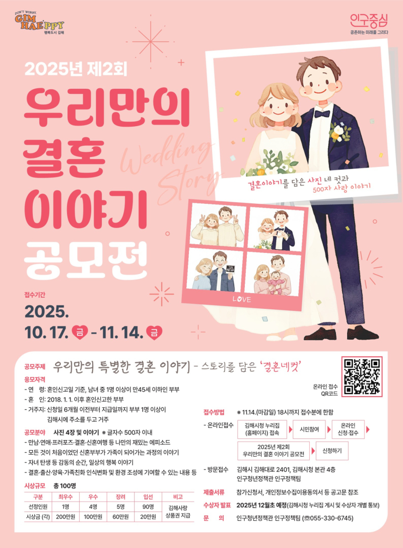 신청 대상은 2018년 1월 1일 이후 혼인신고를 완료한 부부 중 ‘혼인신고일 기준 배우자 1인 이상이 만 45세 이하’ ‘신청일 6개월 이전부터 시상금 지급일까지 부부 중 1명 이상이 김해시에 주소를 둔 시민’이면 누구나 참여할 수 있다.