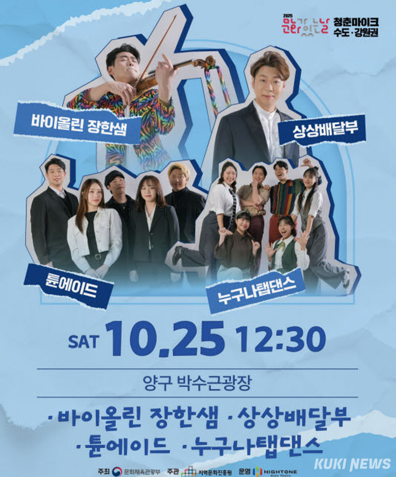 공연은 24일 오후 6시 30분 국토정중앙면 별난무대와 25일 낮 12시 30분 양구읍 박수근광장에서 각각 진행된다. 양구의 대표 문화공간을 무대로 펼쳐지는 이번 공연에는 다양한 장르의 청춘 아티스트들이 참여해 풍성한 무대를 선사할 예정이다.