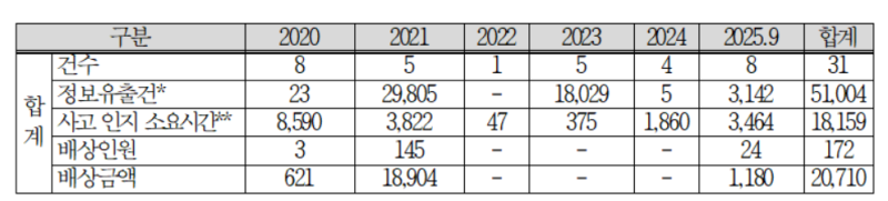 2020년부터 지난달 말까지 집계된 금융권 해킹 사고는 총 31건이다. 연도별로는 2020년 8건, 2021년 5건, 2022년 1건, 2023년 5건, 2024년 4건으로, 올해 들어 다시 급증세로 돌아섰다. 이들 사고로 유출된 개인정보는 총 5만1004건에 달했다. 피해 배상 인원은 172명, 배상금액은 2억710만원이었다.