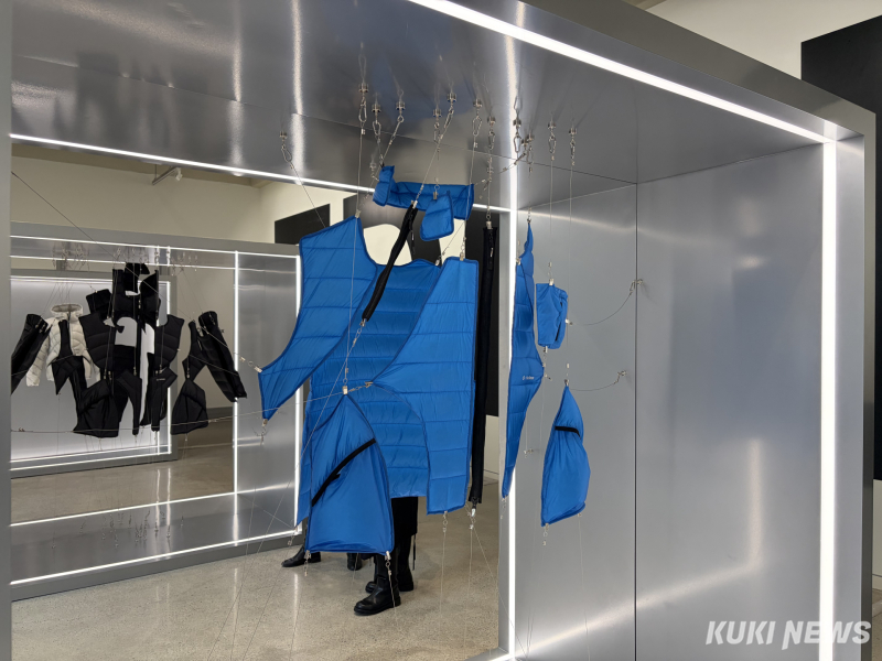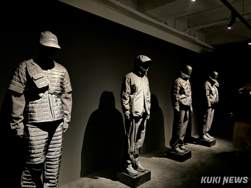 한남동에서 열린 ‘HELINOX THE FIRST EDITION: 초판본’ 팝업스토어에서는 약 60여착장의 컬렉션이 공개됐다. 이번 시즌 키 컬러는 ‘사이언 블루(Cyan Blue)’로, 브랜드가 지향하는 기술적 감성과 도심적 미감을 함께 표현했다. 전시 공간은 1층의 ‘에디션1(Edition1)’ 존과 2층 쇼케이스로 구성됐다. 1층에서는 브랜드의 핵심 아이템인 이클립스 팩 다운 재킷과 베스트를 중심으로 제작 과정과 모듈형 구조가 소개됐다.