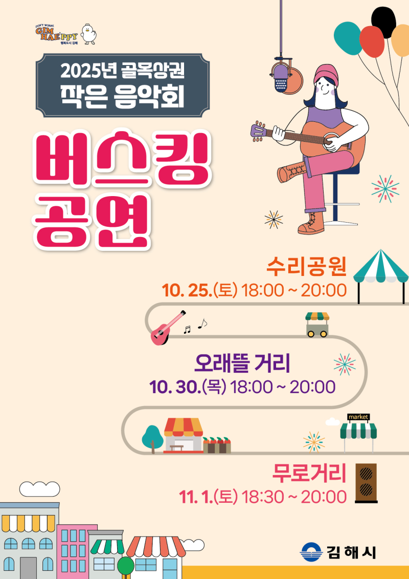 작은음악회는 25일 오후 6시 삼계동 수리공원에서 시작한다. 30일에는 인제대 오래뜰거리에서 대학 동아리 학생들의 열정 넘치는 공연으로 진행한다. 11월 1일에는 내동 무로거리에서 화려한 경관조명과 함께 버스킹 공연을 진행한다.