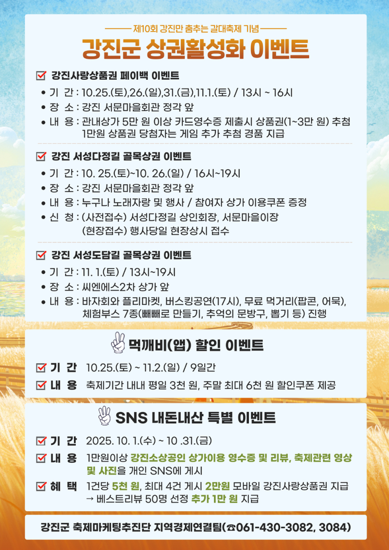 이번 이벤트는 강진사랑상품권 페이백 이벤트, 강진 서성다정길 골목상권 이벤트, 강진 서성도담길 골목상권 이벤트, ‘강진맛깨비’ 먹깨비 할인 이벤트, SNS 내돈내산 특별 이벤트 등이 있다.