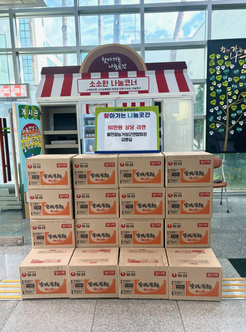 거창군 거창읍 지역사회보장협의체는 지난 22일 쌀전업농 거창군연합회 김병길 회장이 관내 어려운 이웃들을 위해 거창읍 공유냉장고 ‘찾아가는 나눔곳간’에 라면 20박스를 기부했다.