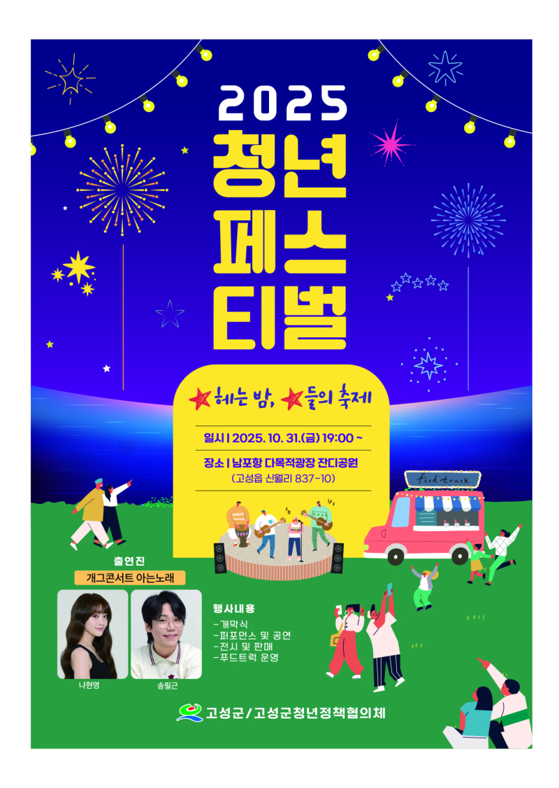 고성군은 오는 10월 31일 오후 7시부터 9시까지 남포항 다목적광장 잔디공원에서 ‘2025 고성군 청년페스티벌’을 개최한다고 밝혔다.