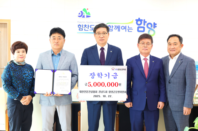 대한전문건설협회 경남도회 함양군운영위원회는 “건설업계가 지역사회 발전의 밑거름이 되길 바라는 마음으로 장학금을 기탁하게 되었다”라며, “지역 청소년들이 꿈을 키워나갈 수 있도록 응원하겠다”라고 전했다.