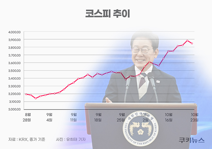 27일 한국거래소(KRX)에 따르면 코스피는 이재명 정부 출범 이후 4개월여 만에 46% 상승률을 기록했다. 제21대 대통령 선거 전날인 지난 6월2일 2698.97로 마감했던 지수는 전 거래일 3941.59까지 뛰었다.