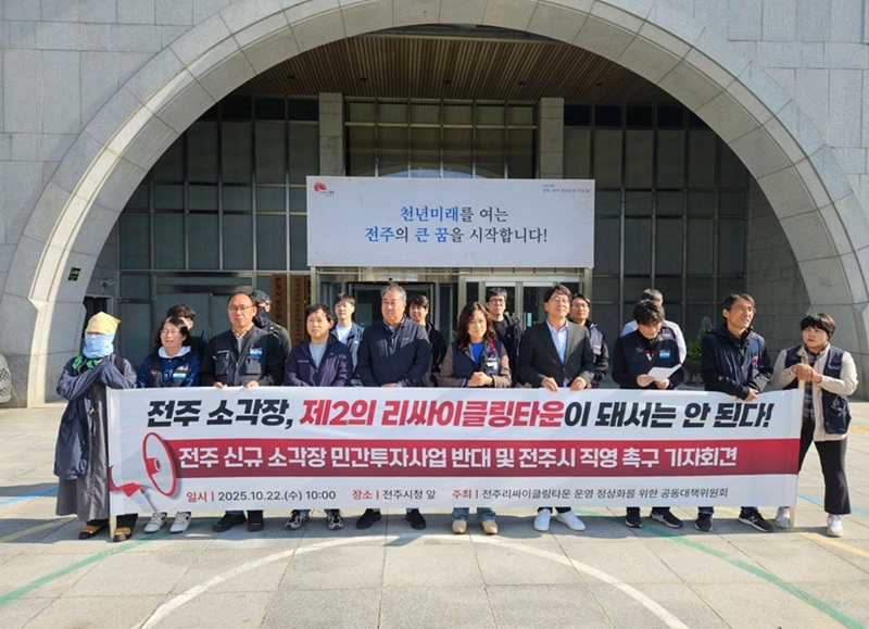 전주리싸이클링타운 운영 정상화를 위한 공동대책위원회는 지난 22일 전주시청 앞에서 기자회견을 열고 “전주 신규 소각장 사업은 ‘제2의 리싸이클링타운 사태'로 전락해서는 안 된다”며 “민간투자사업에 미련을 버리고 전주시가 직접 운영하는 방식으로 공공성과 안전성을 확립해야 한다”고 촉구했다.