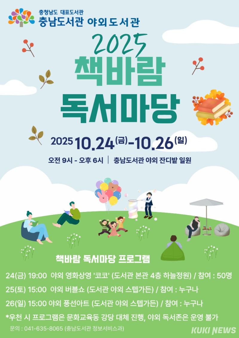 충남도서관은 오는 24∼26일 충남도서관 일원에서 ‘2025 책바람 독서마당’ 야외도서관 행사 및 문화 프로그램을 진행한다고 23일 밝혔다.