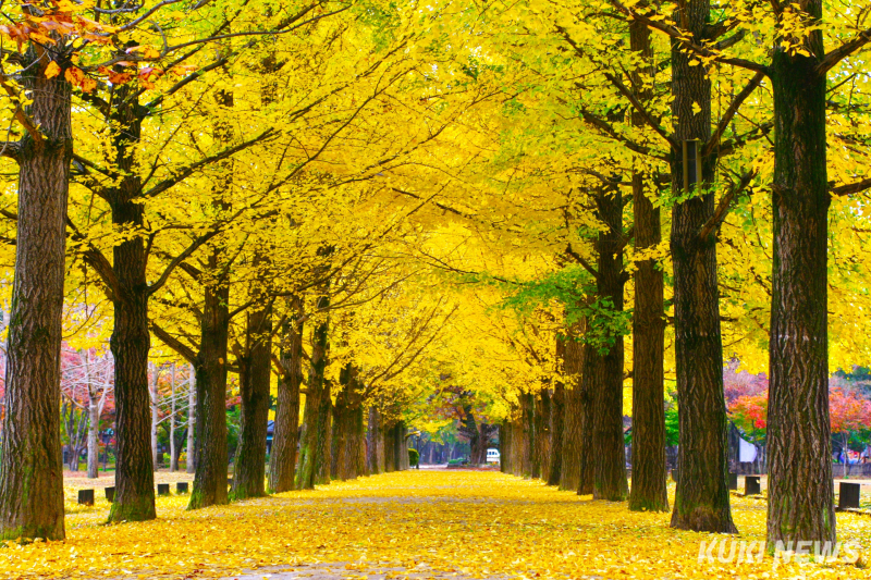 남이섬의 가을은 계수나무·단풍나무·메타세쿼이아·은행나무·자작나무가 어우러지며 섬 전체가 오색빛 화폭으로 물드는 10월 중하순부터 11월 중순까지 절정을 이룬다.