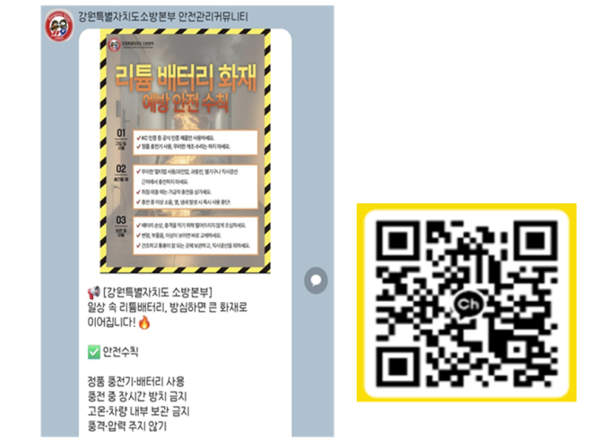 강원특별자치도 소방본부가 직접 운영하는 카카오톡 공식 채널 '안전관리 커뮤니티'는 도내 소방안전관리자, 위험물 안전관리자 등 16000여 명을 대상으로, 화재 등 각종 사고에 대한 예방과 대응 요령, 소방 법령 등을 신속하게 전달하는 디지털 커뮤니티 정보 플랫폼이다.