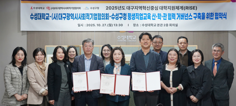 수성대는 세 기관이 27일 ‘평생직업교육 산·학·관 거버넌스 구축 협약식’을 열고 웰니스 1인 로컬크리에이터 실무자 양성과정을 공동 운영한다고 밝혔다.