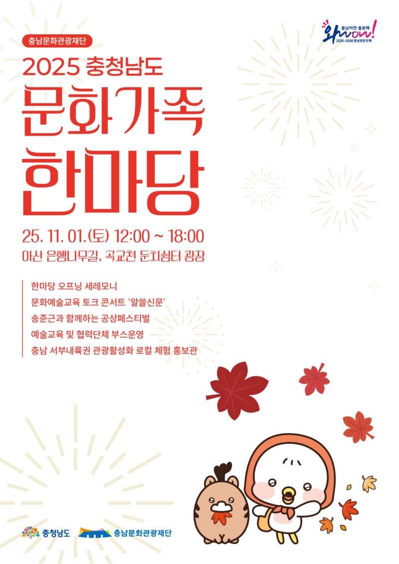 충남문화관광재단이 11월 1일 아산 은행나무길과 곡교천 둔치 전역에서 문화․예술․관광이 어우러진 가을 축제 ‘충남문화가족한마당’을 개최한다.