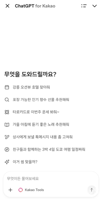 이는 챗GPT 포 카카오가 카카오의 다양한 서비스와 연동되는 AI에이전트인 ‘카카오 툴즈’ 덕분이다. 현재 카카오 툴즈에는 △카카오맵 △카카오톡 예약하기 △카카오톡 선물하기 △멜론 등이 포함돼, 이용자의 질문에 맞는 서비스를 자동으로 매칭한다.
