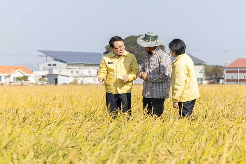 정헌율 시장은 29일 오산면 신지리 일원 안성환 우리밀영농조합법인 대표의 농가 포장을 방문해 피해 벼를 직접 살펴보고, 신속한 피해조사와 복구비 지원을 위한 대책을 논의했다.