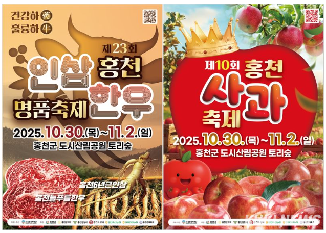 홍천군은 30일부터 11월 2일까지 4일간 도시산림공원 토리숲 일대에서 '제23회 홍천 인삼·한우 명품축제'와 '제10회 홍천사과축제'를 동시에 개최한다.